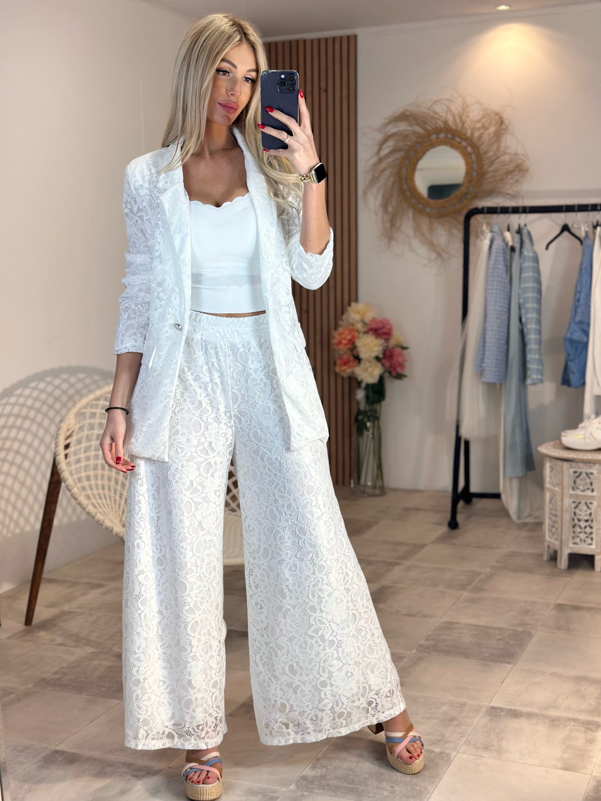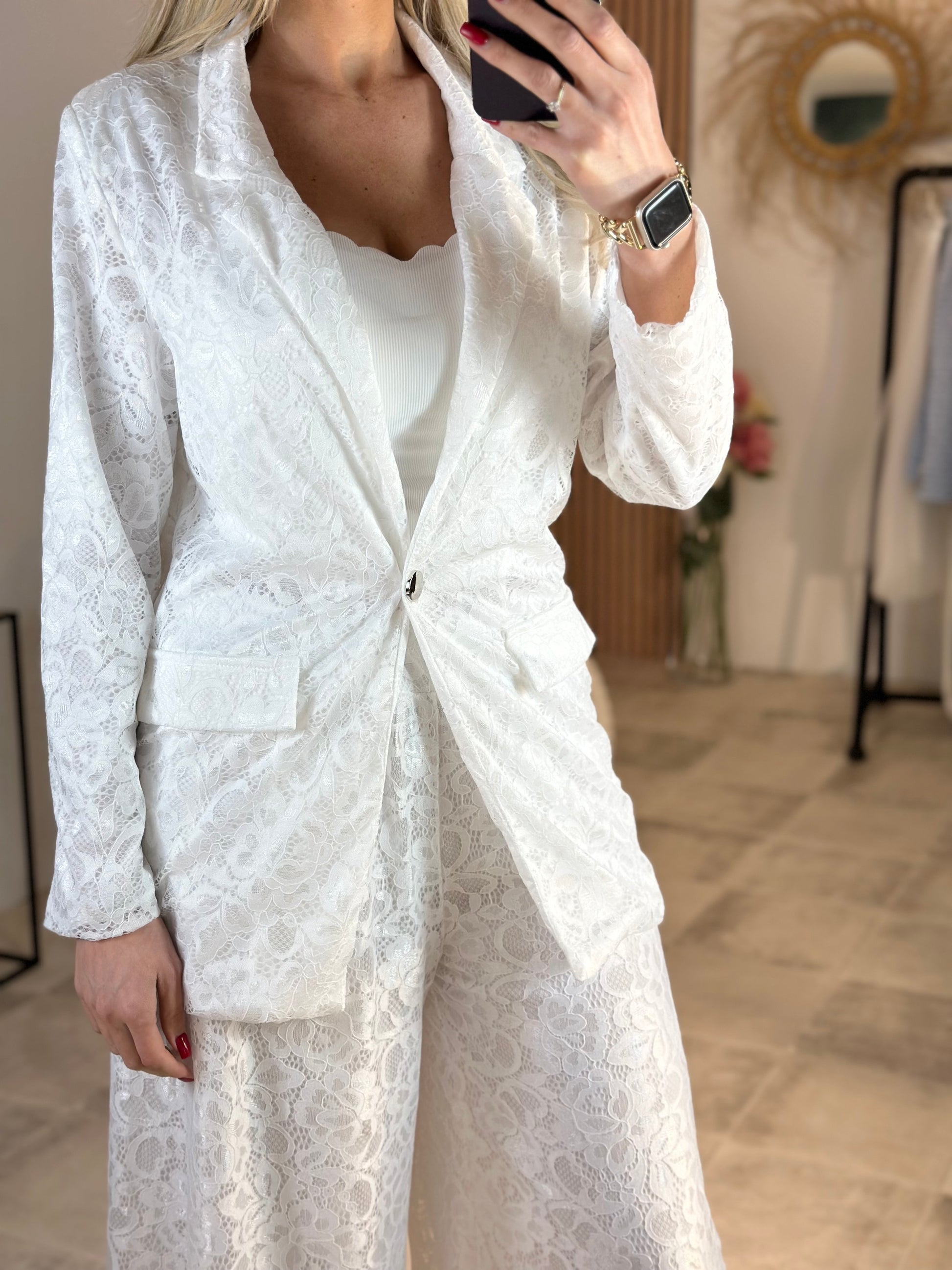 Ce blazer blanc en dentelle est un ajout élégant à toute garde-robe. Le tissu en dentelle ajoute une touche féminine et raffinée, tandis que la coupe du blazer offre une silhouette élégante et professionnelle. Parfait pour les occasions spéciales ou pour ajouter une touche sophistiquée à votre tenue de travail.