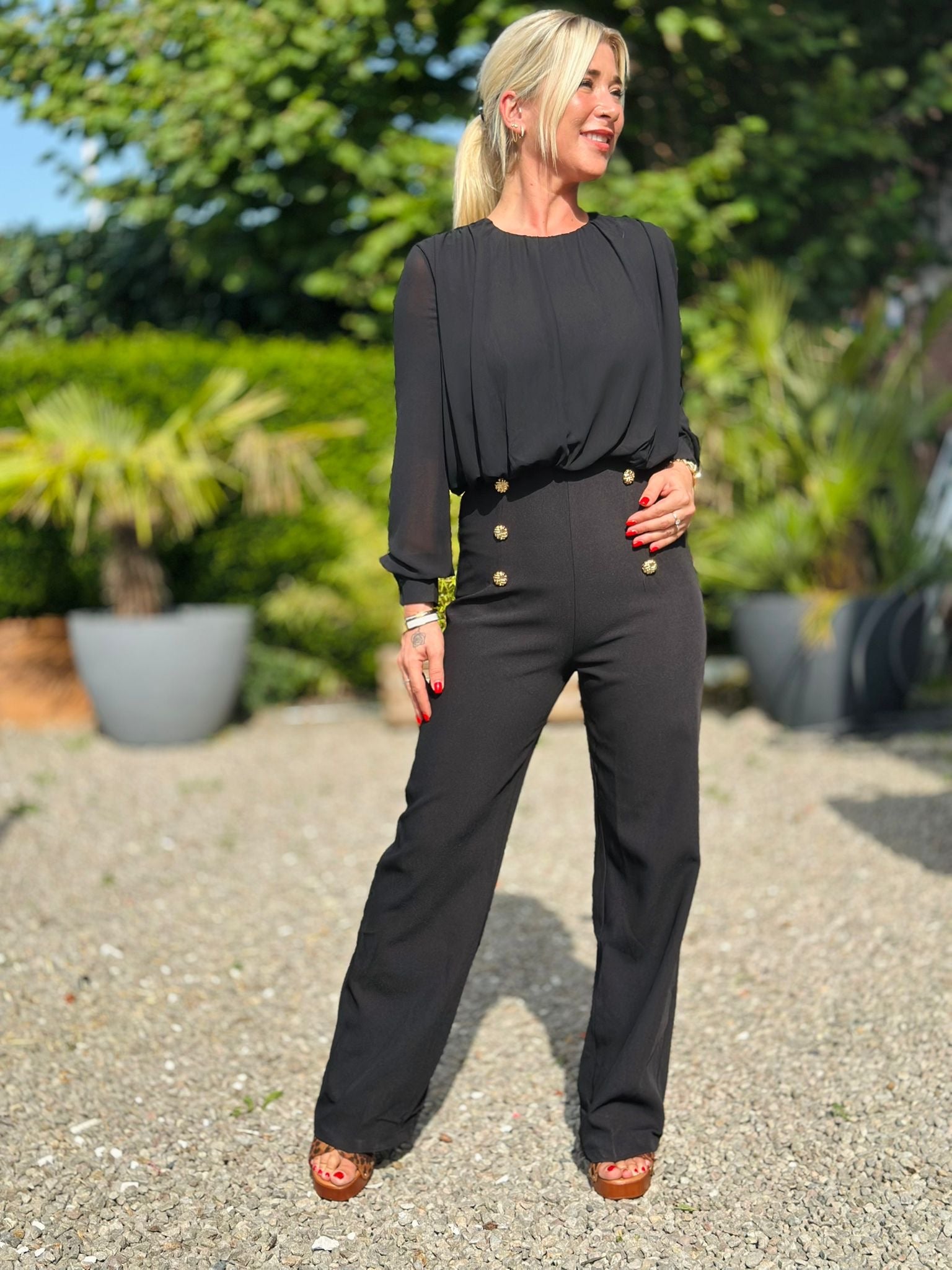 La combinaison « IRENE » est une tenue élégante et polyvalente. Le pantalon noir met en valeur votre silhouette tandis que les boutons dorés ajoutent une touche de charme. Les manches en voile apportent une légèreté et une féminité à votre look. Parfait pour les occasions spéciales ou pour une tenue de travail sophistiquée.