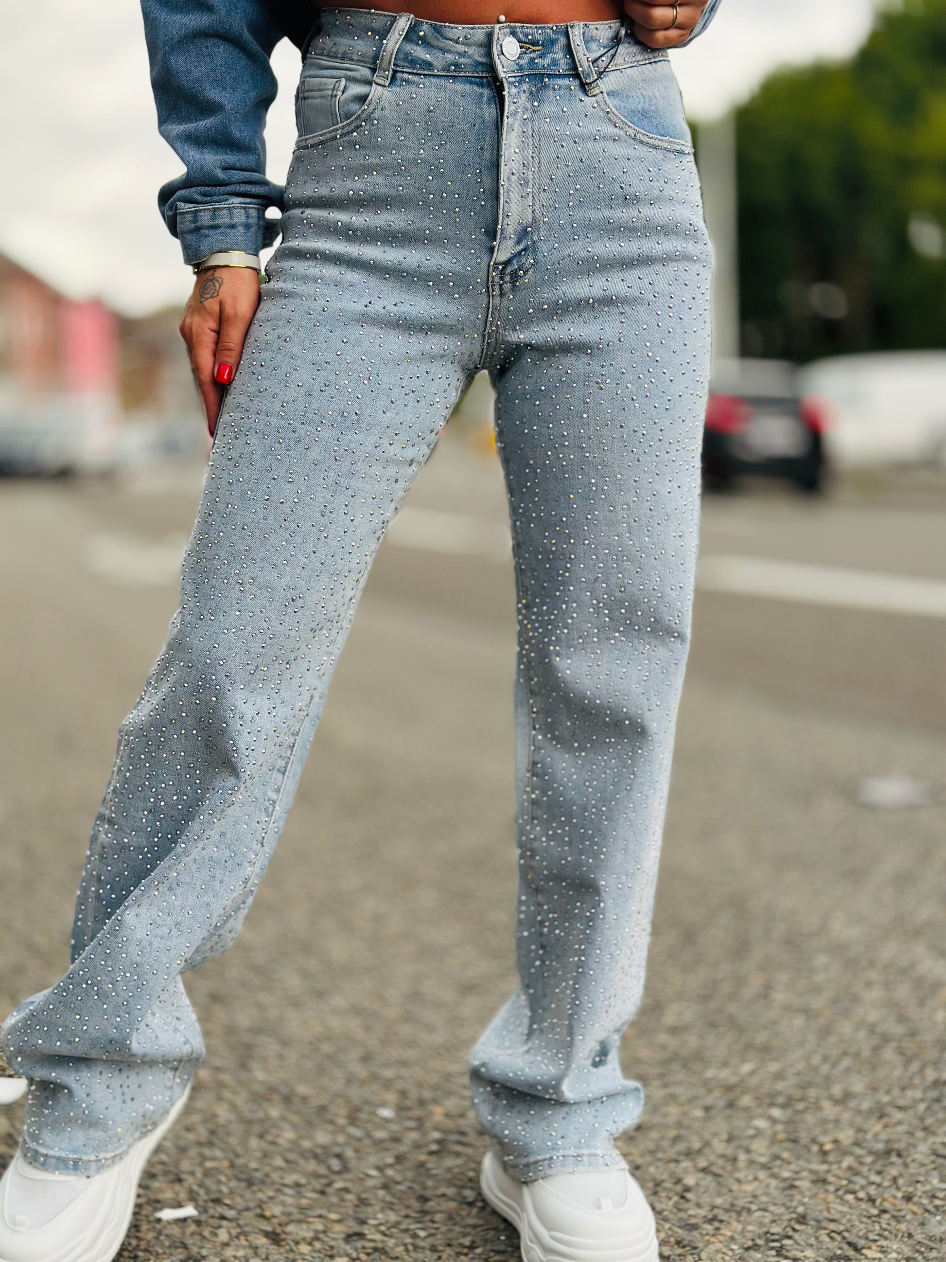 Les jeans "STRASSY" BLEU ajoute une touche de glamour à votre tenue avec ses strass bleus étincelants. Parfait pour un look décontracté mais élégant.
