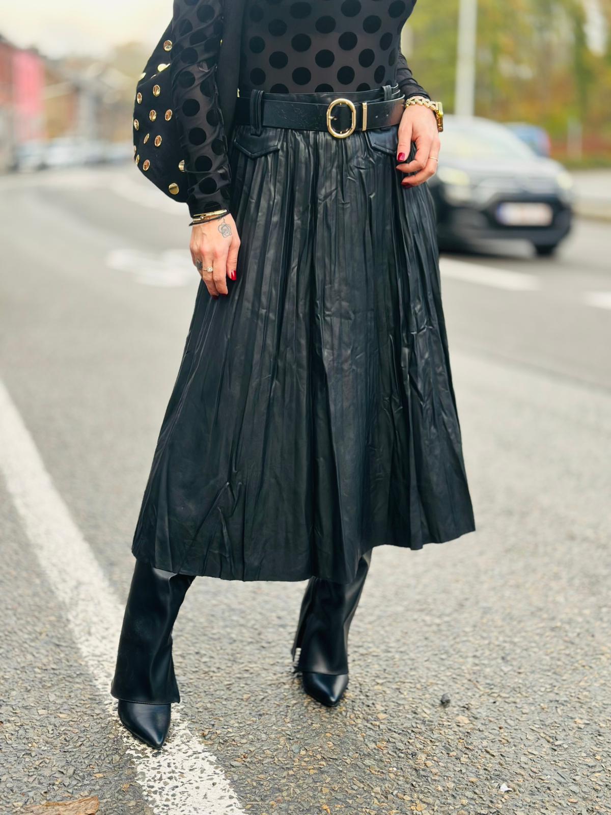 Cette jupe « HAVANA » noire en simili cuir possède un élégant effet plissé. Ajoutez une touche de sophistication à votre garde-robe avec cette pièce polyvalente. Parfait pour une sortie en soirée ou pour ajouter une touche de style à votre tenue de travail.