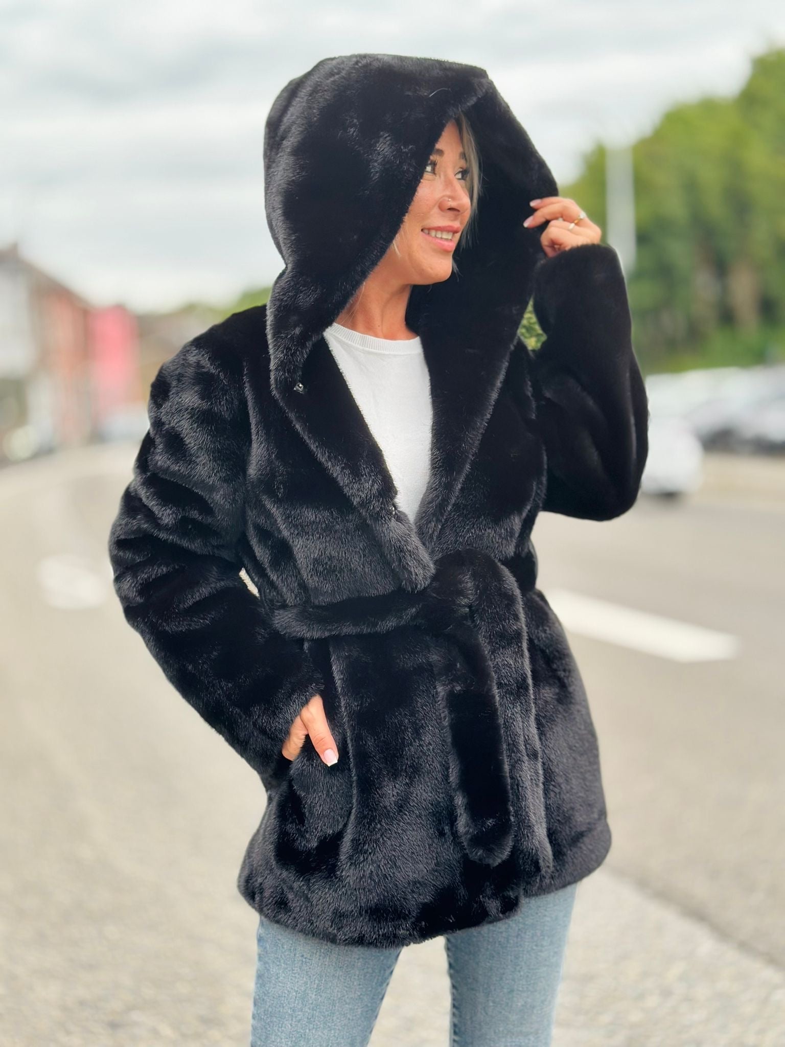 Ce manteau noir avec fourrure et capuche « ROULIETTE » est l'alliance parfaite de la chaleur et du style. Il vous tiendra chaud lors des journées froides tout en vous donnant un look élégant.