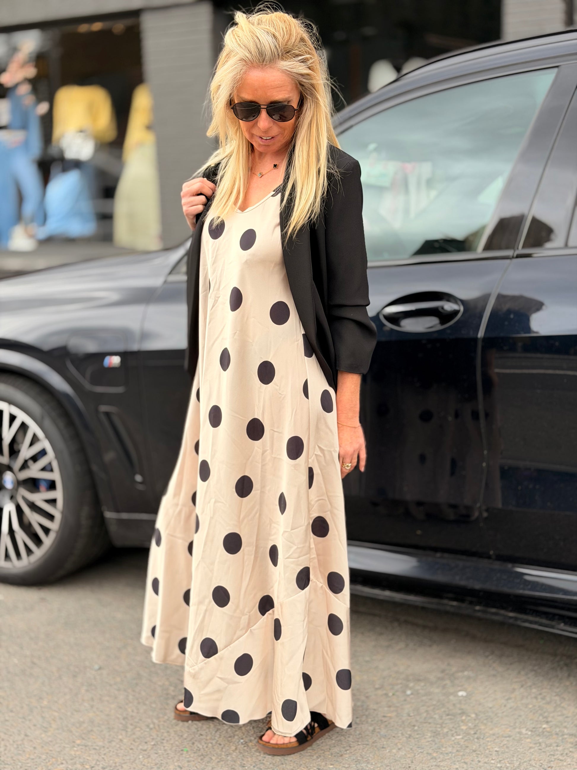 Robe en satin avec pois chocoLa robe "Beige Petit Pois" est confectionnée en satin, offrant une texture lisse et agréable au toucher. Sa longueur et son motif à pois chocolat ajoutent une touche d'élégance classique. Idéale pour des occasions formelles, cette robe combine confort et sophistication, garantissant une allure soignée.