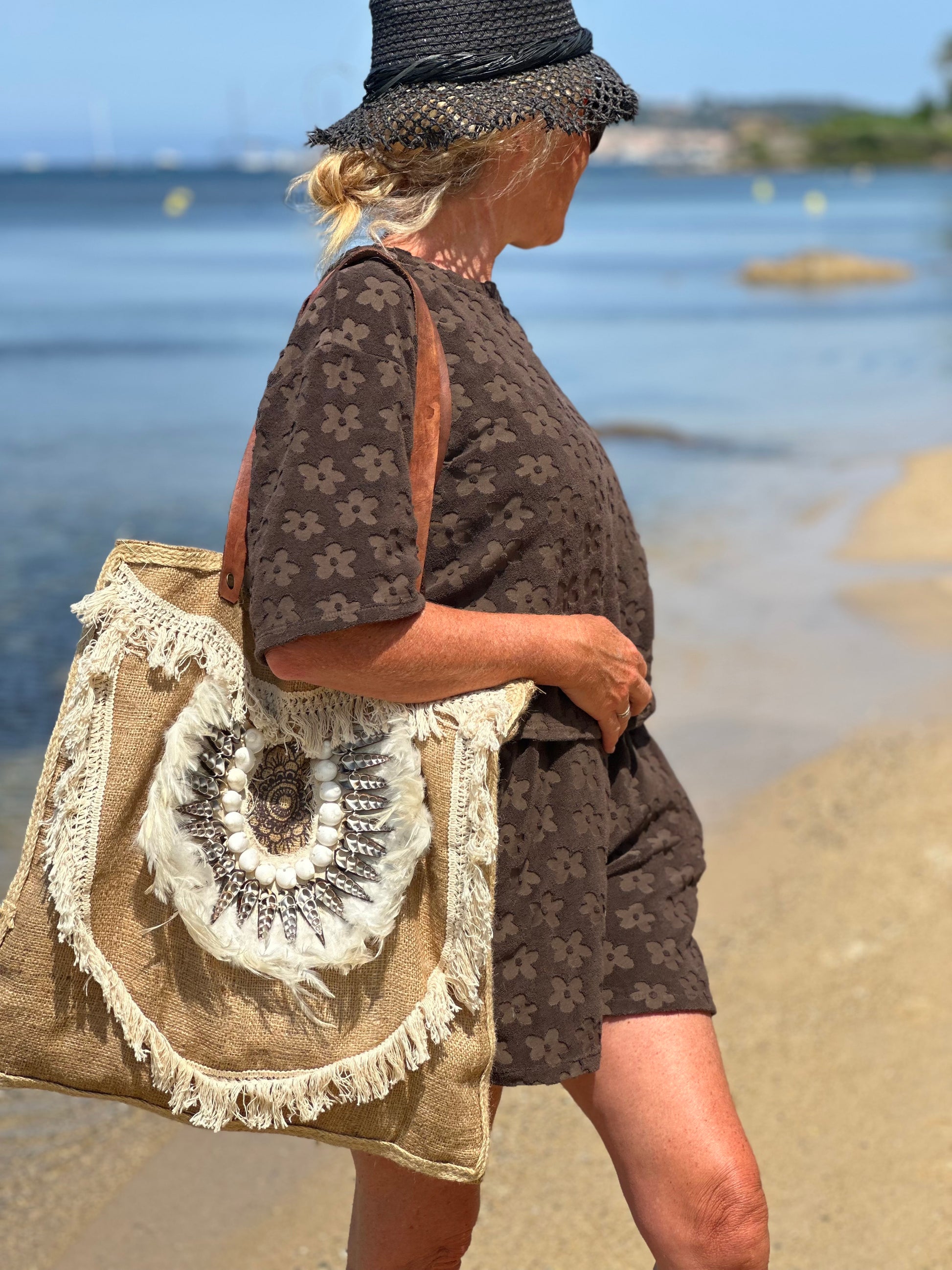 Apportez une touche d’évasion à vos looks avec ce sublime sac bohème fait main, orné de plumes naturelles, de coquillages et de détails ethniques. Fabriqué en toile de jute épaisse, il allie authenticité et élégance pour vos journées plage ou vos virées estivales.