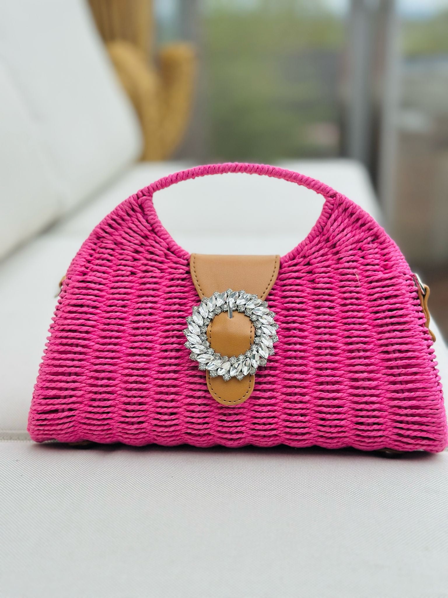 Ce sac PAMPELONE en rotin rose avec boucle en strass est l'accessoire idéal pour compléter votre look chic et tendance. Fabriqué en rotin de haute qualité, ce sac est à la fois solide et élégant. La boucle en strass apporte une touche de glamour à ce sac à main intemporel.