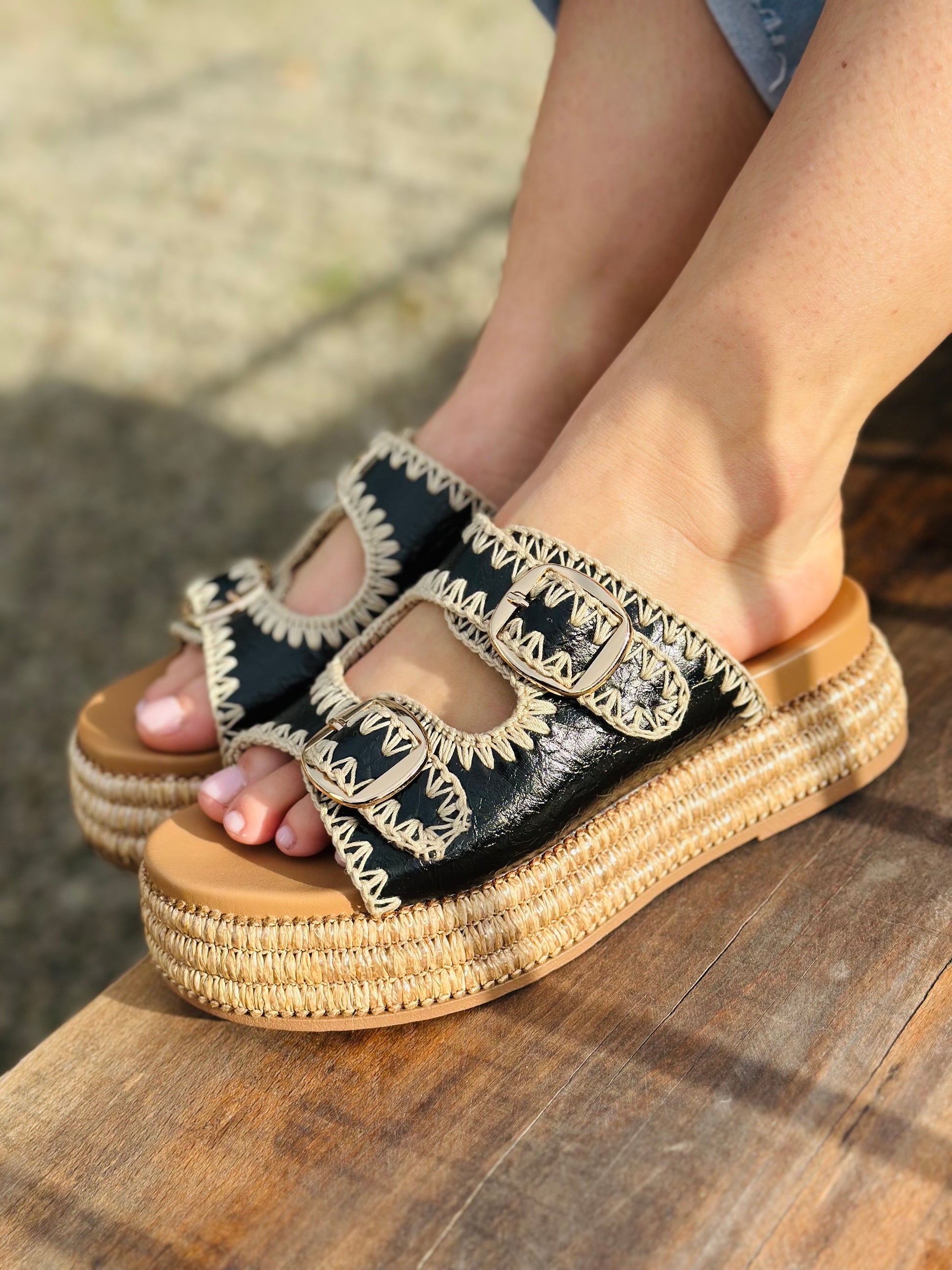 - Semelle : Elastomère, semelle compensée en raphia tressé