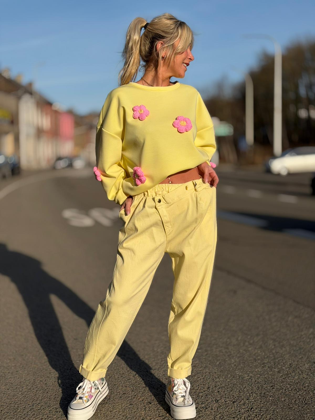 Craque pour ce sweat ultra-tendance jaune soleil, sublimé par de délicates fleurs roses en relief 🌼